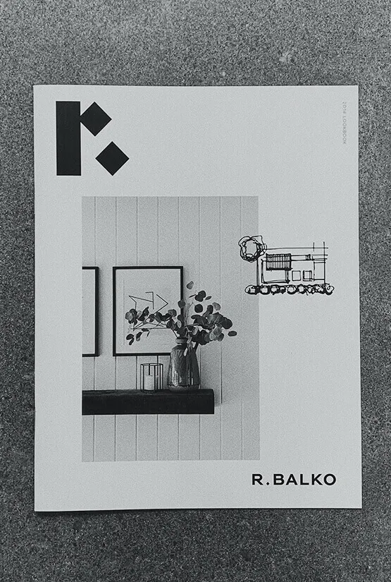 The bespoke R. Balko wordmark and R symbol were crafted to embody the same clean lines and angles found in Roger's work.